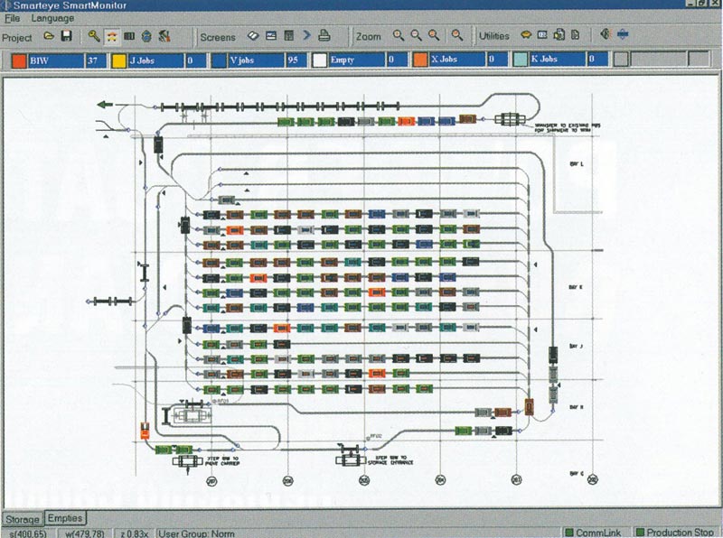 After a few months of fine-tuning, the 15-lane bank performs all of the duties that were expected and then some. Along with the dynamic bank controls for color blocking and trim resequencing, GM Holden also wanted a database system that could gather and store historical data on color blocking efficiencies, trim shipment history, production counts and other diagnostic information for the system. Just-in-time trigger points were also added from the bank control system to the plant-wide scheduling system as vehicles exit the bank en route to trim to improve material disbursements and shipments to the plant.